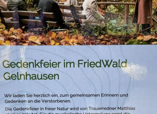 Am Sonntag, dem 1. September 2024, um 14 Uhr Uhr findet eine Gedenkfeier für die Verstorbenen Personen, geleitet von einem unserer Trauerredner Mathias Hacker, im Friedwald Gelnhausen statt. Für die musikalischen Klänge sorgt Harfenistin Bettina Linck.